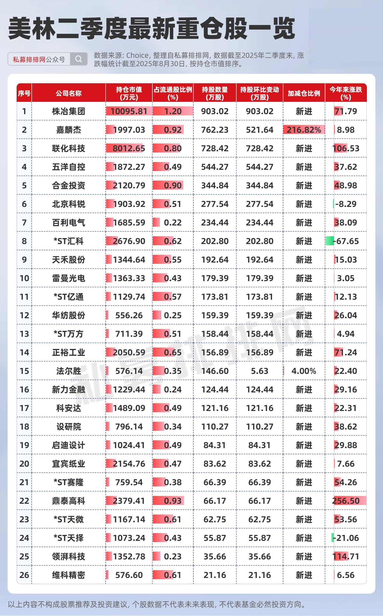 截至二季度末,美林位列A股26家上市公司的前十大流通股东名单(2024年底为11家),今年以来涨幅均值为55.68%,合计持有市值约为5.21亿元,相比2024年底的2亿元,增长超3亿元。美林三季度重仓股中涨幅在100%以上仅3只个股,分别是联化科技、鼎泰高科、领湃科技。