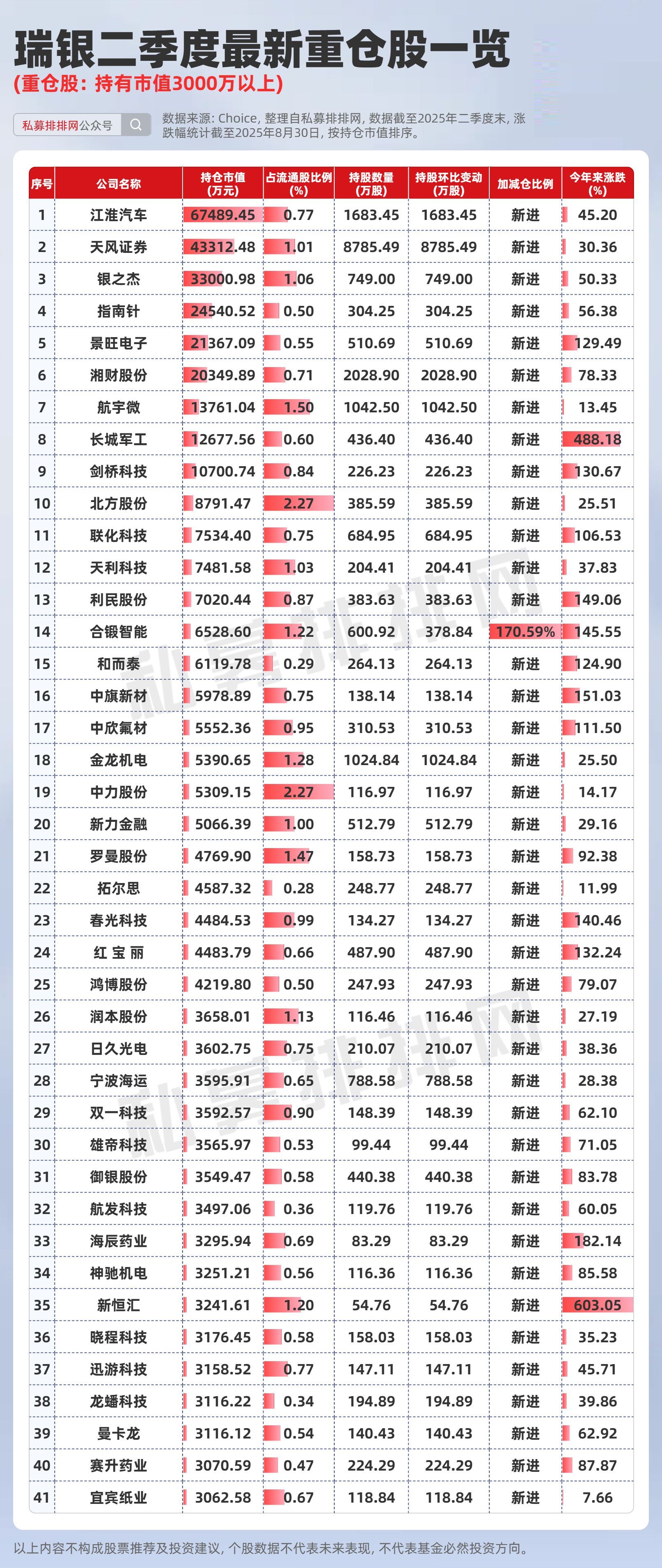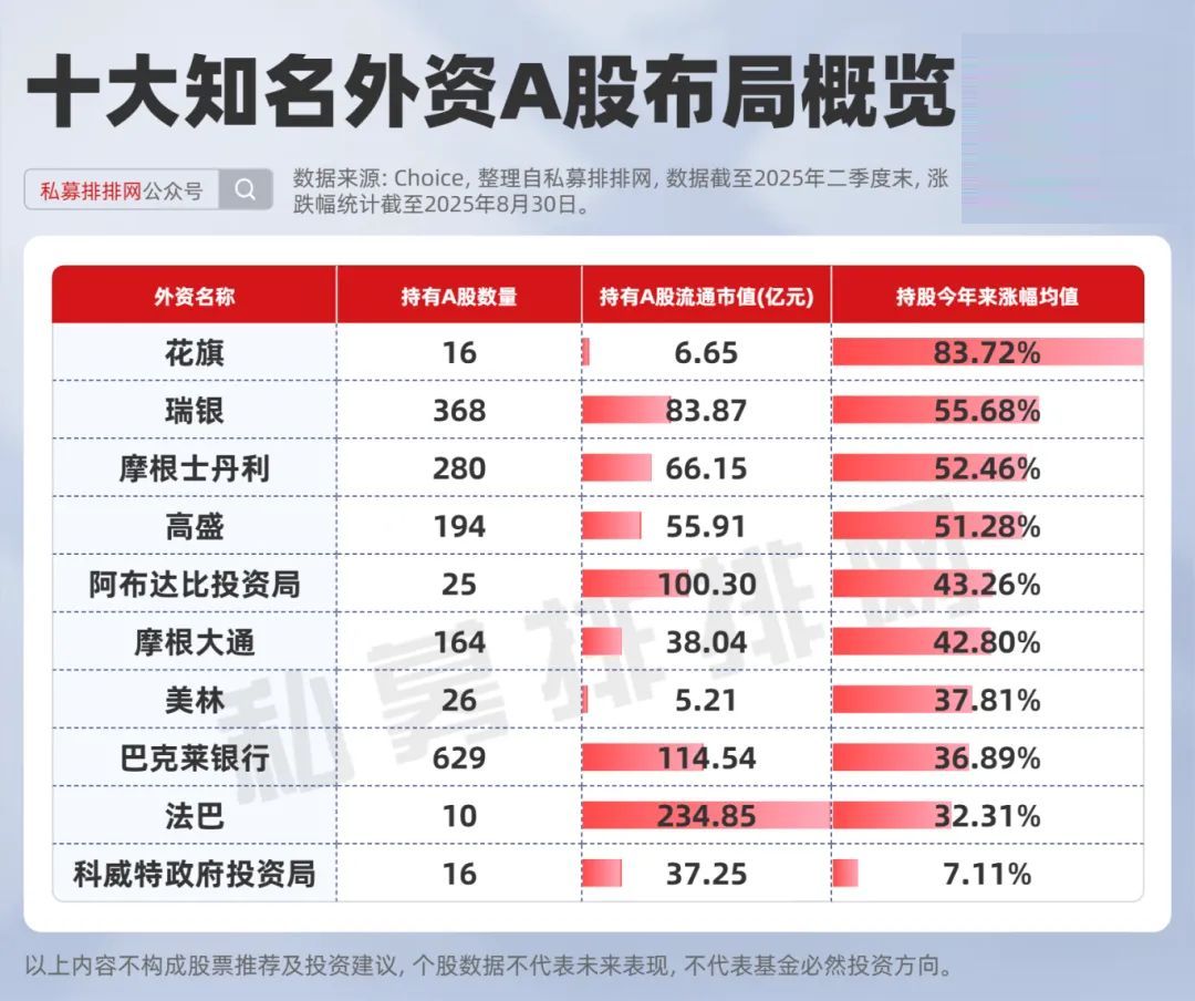 截至二季度末,巴克莱银行位列A股629家上市公司的前十大流通股东名单(2024年底仅为115家),今年以来涨幅均值为36.89%,合计持有市值约为114.54亿元,相比于2024年底的13.27亿元,A股持仓市值大幅提升超百亿。