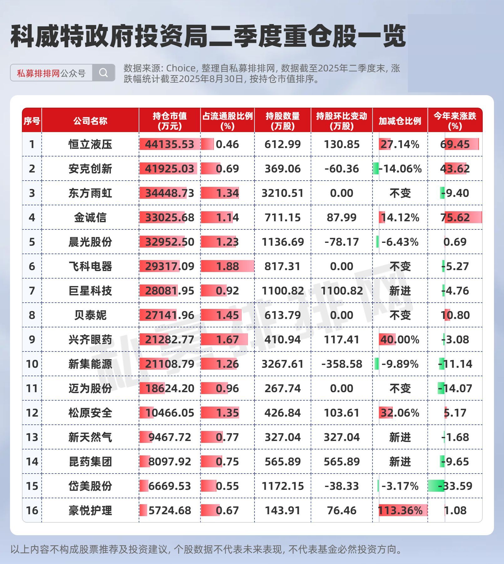从持仓股浮盈来看,科威特投资局重仓的这16家公司,自二季度末以来涨幅均值为15.56%,其中前两大重仓股恒立液压、安克创新,二季度分别被科威特投资局重仓持有4.41亿元、4.19亿元,二季度末以来涨幅为27.36%、27.23%,预计将分别带来浮盈约为1.21亿元、1.14亿元。