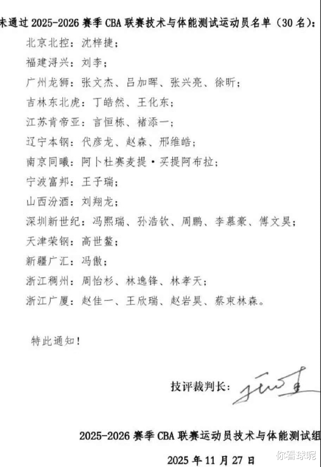新赛季CBA尚未鸣哨,体测战场已掀起滔天巨浪!11月27日,CBA官方公布的体测结果:北控核心沈梓捷、广州潜力中锋徐昕、深圳"双老"李慕豪与周鹏、新疆新星冯傲、广厦射手赵岩昊等人赫然出现在30人未通过名单中,而首次推行的"末位淘汰制"更让这场风波雪上加霜。