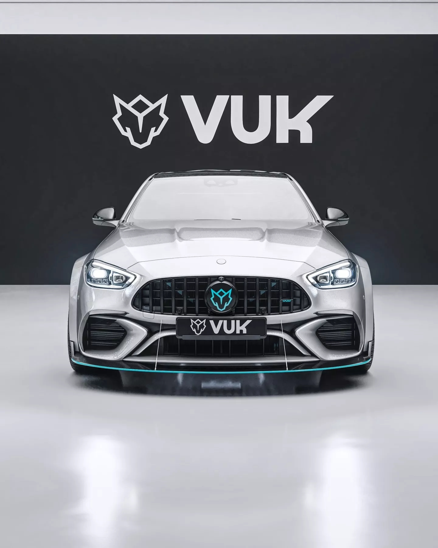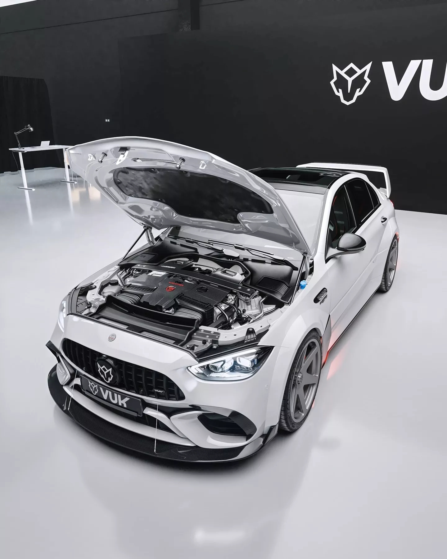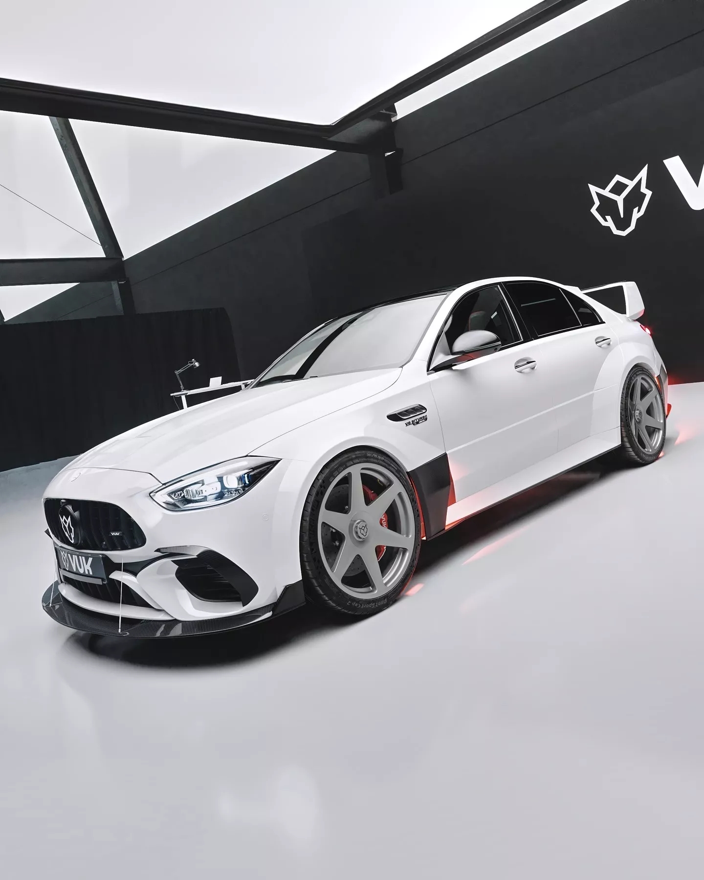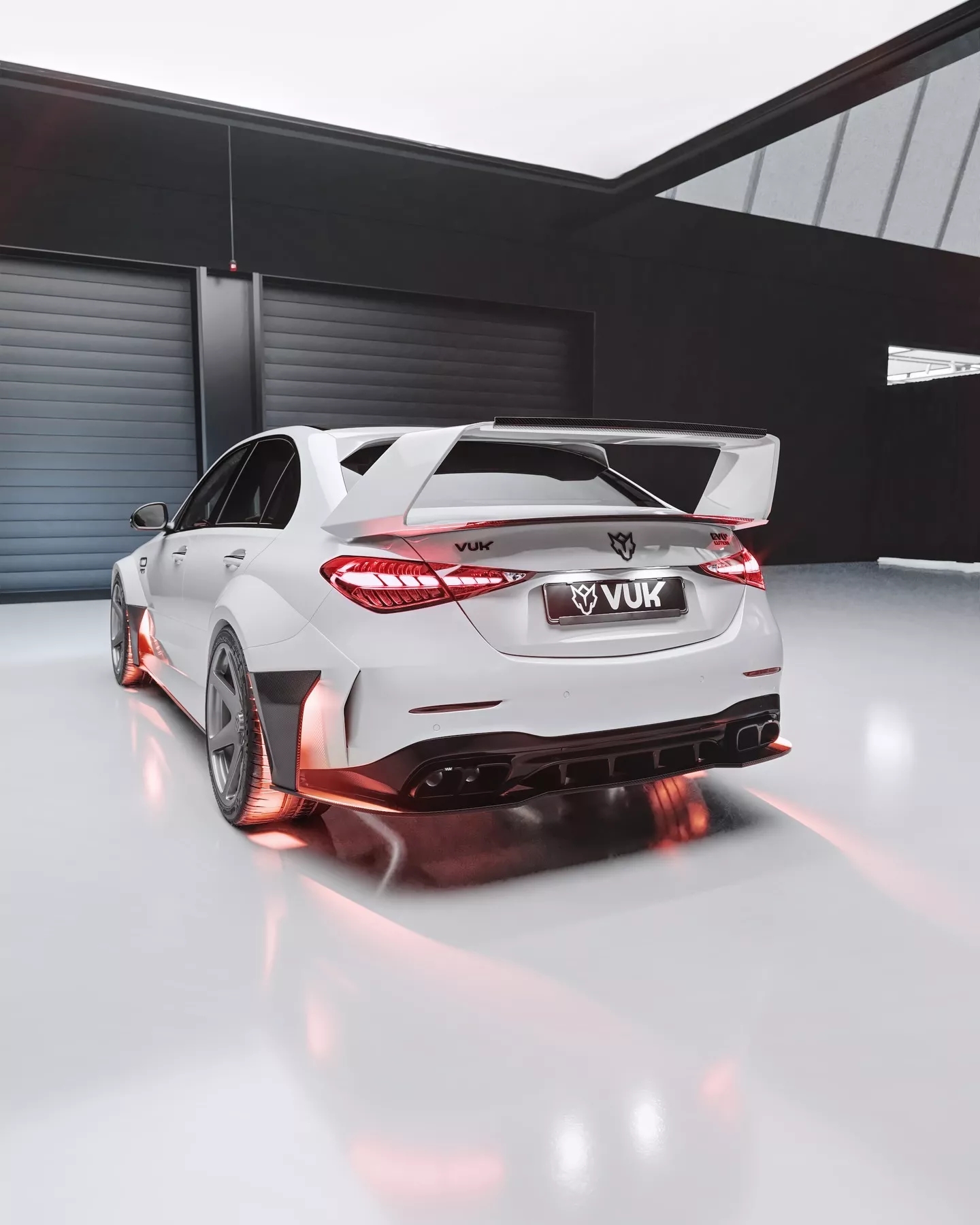 虽然AMG的2.0升发动机在这款超级轿车上有很多不足之处,但这辆车出厂时的外观确实相当漂亮。Vuk在外观改造上不遗余力,设计了一套可能会让一些AMG高管感到震惊的车身套件。首先是车头,那里有一个大型分流器,并配有贯穿保险杠的加强杆。