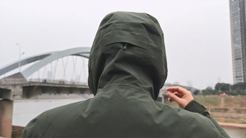 风帽一戴,谁都不爱。帽口和帽后有多维的调节扣,一拉一锁,它便妥帖地合乎头型,不遮挡视线,也不怕侧风吹乱。