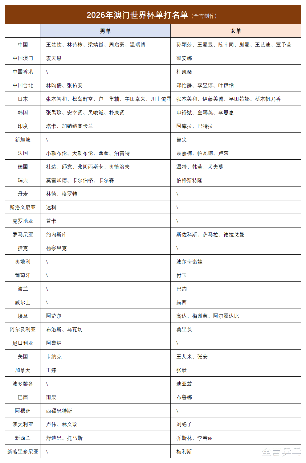 2026年3月4日,国际乒联澳门世界杯96人大名单正式公布,中国队再次确认了2月28日报上的11位运动员,人数之多高居各协会榜首,日本也有9人拿到资格、仅次于国乒,此外再也没有球队能拿到理论上限名额(4男4女),详细情况请看下文。