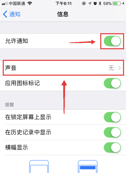 4.进入到信息页面后,点击开启“允许通知“,然后点击“声音”。