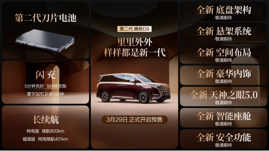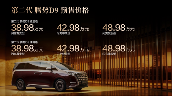 3月29日,第二代腾势D9正式开启预售,售价区间为38.98万元至48.98万元。作为科技豪华旗舰MPV,新车集比亚迪第二代刀片电池、天神之眼5.0等前沿科技于一身,在电动、智能、豪华设计等领域实现全维进化,重塑豪华MPV价值新标杆。