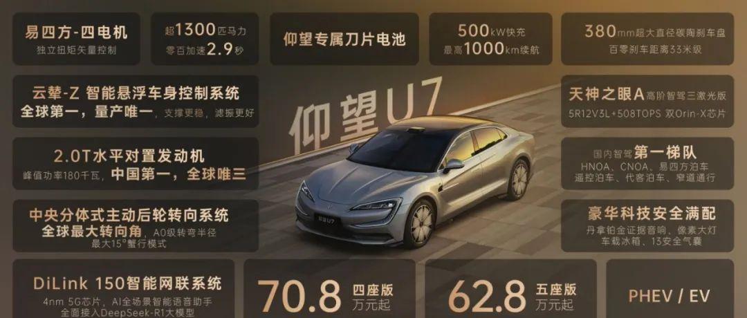 而当我们走进车内,仰望U7的“星环座舱”设计理念让人印象深刻。车内采用了大量高档材料,如真木门板与碳纤维饰板,整体内饰展示出一种奢华质感。中控台配备的12.8英寸OLED曲面屏幕,以及23.6英寸的全液晶仪表盘与副驾娱乐屏,无疑提升了整车的科技氛围。此外,车载智能网联系统配合最新的4纳米座舱芯片,不仅提升了操作的流畅性,还为用户提供了便捷的智能体验。尤其是在科技形态日益丰富的今天,这种设计与科技的结合显得尤为重要。