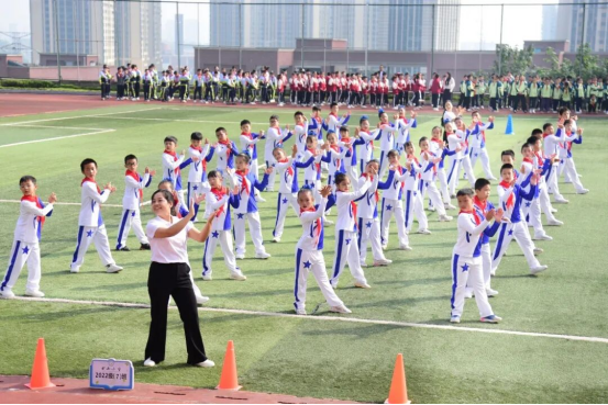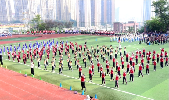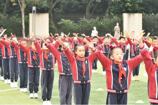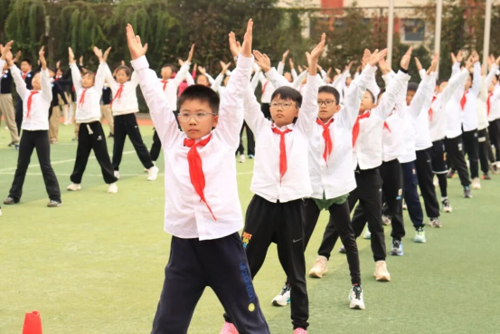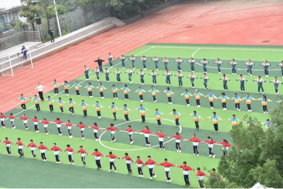 运动会前夕,全校广播体操比赛率先预热。绿茵场上,各班级方阵队列俨然,学生们动作舒展有力、节律规整划一,在整齐的节拍中展现着青春活力。这场全员参与的赛事,既是日常大课间训练成果的集中检验,更是班级凝聚力与集体精神的直观呈现,于潜移默化中传递着金山校园“至善”德育理念,也暗合了“低碳运动”简约见精神的核心内涵。