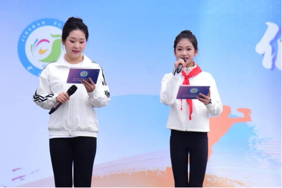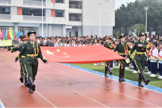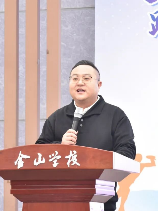 开幕式当天,国旗、校旗、彩旗方阵依次引领入场,各年级代表队步伐铿锵、口号嘹亮。学生们手持可再生材料制作的创意道具,将绿色环保理念具象化为赛道旁的鲜活风景,简约而不失庄重的仪式感,彰显着“低碳办赛”的实践初心。随后,金山教育集团各校区领导致辞寄语,集团党总支书记徐龙海宣布运动会正式开幕。