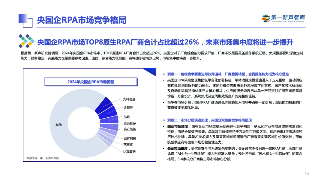谁是领跑者?市场份额背后的选型密码在2024年央国企RPA市场格局中,TOP8的原生RPA厂商合计占据了超过26%的市场份额,市场集中度正在快速提升。
