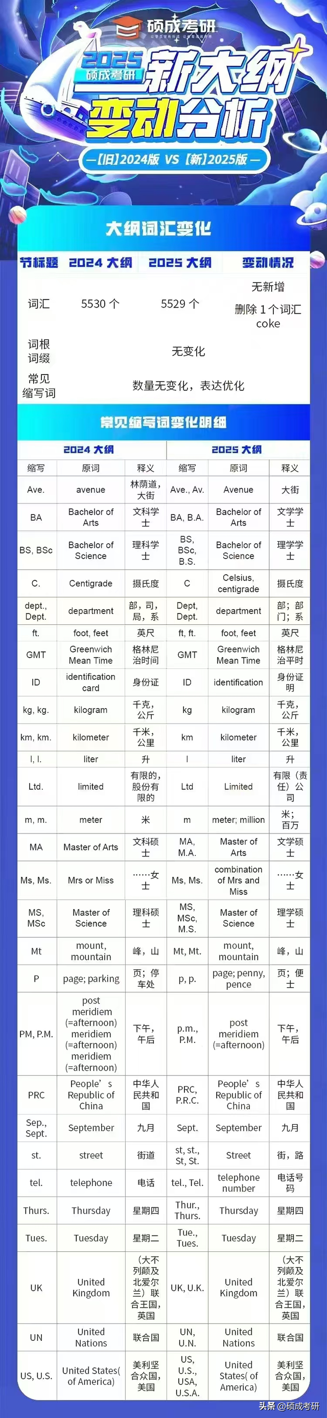 今年考纲实际文字内容和去年对比几乎没有变化,只是考纲词汇少了一个coke (n. 可乐;焦煤),并对常见缩写进行了微调!