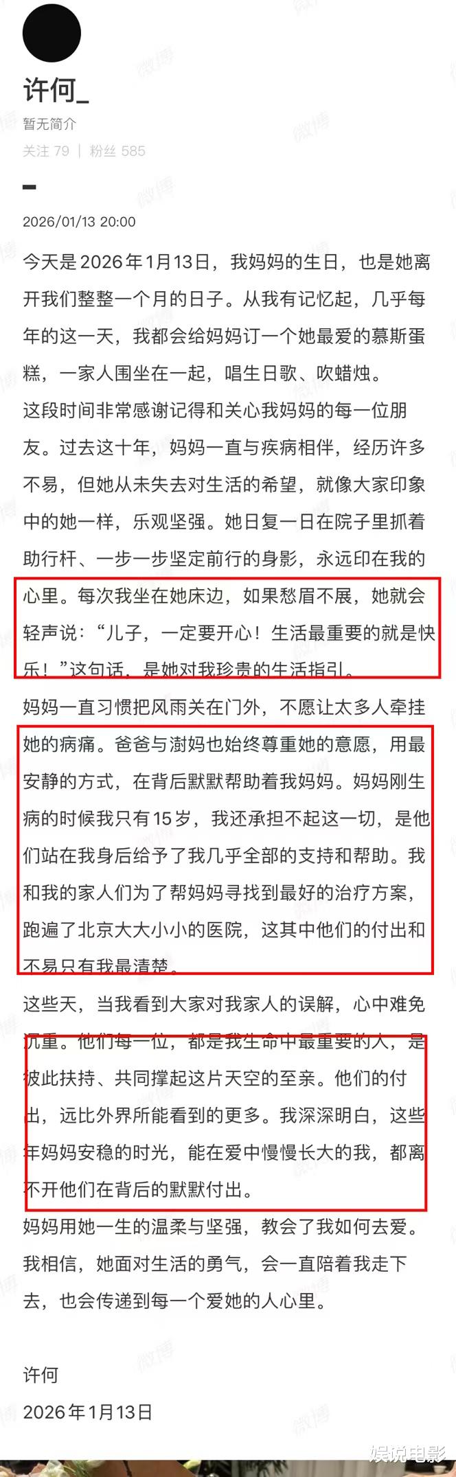 许何表示感谢这段时间记得和关心他妈妈的每一位朋友。