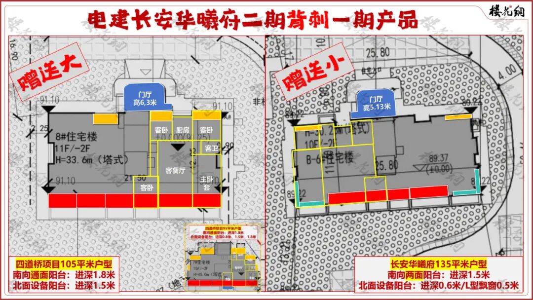 实现了南向三面通面设置了内嵌式阳台,且进深为1.8米;而一期的134平米户型,南向只有两面设置了内嵌式阳台、进深1.5米,另一个是L型飘窗。
