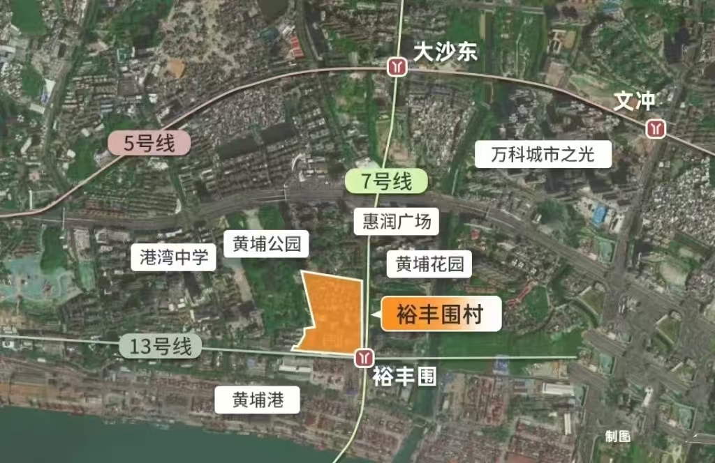 地段很ok,裕丰围地铁站上盖,7/13号线双地铁交汇,东侧是黄埔公园,南向临江,周边是成熟的居住区,配套相当不错。