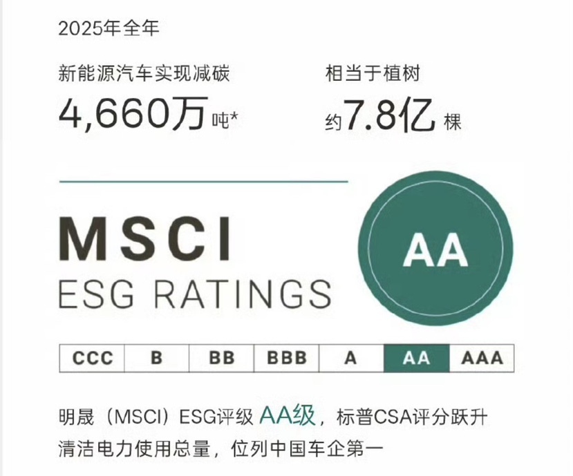 作为行业龙头,比亚迪2025年纳税533亿,远超同期净利润;可持续发展方面,ESG评级获评AA级,稳居国内企业第一梯队,去年新能源汽车全生命周期碳减排减少4660万吨,相当于种了7.77亿棵树。