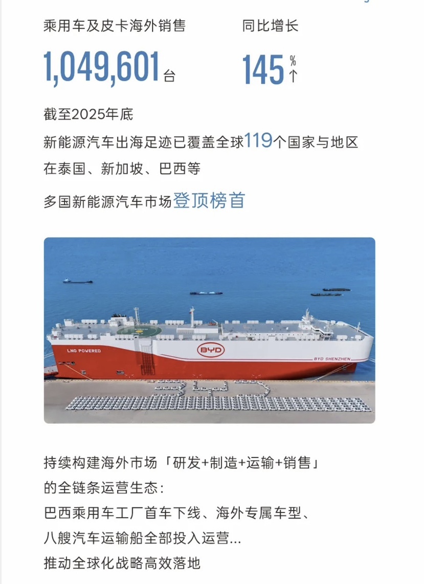 销量上,2025年比亚迪卖出460多万辆(海外105万辆,同比增长145%),杀进全球前五,同时斩获全球新能源汽车销量冠军。特别高端品牌方程豹、腾势和仰望合计卖了近39.7万辆,同比翻了近一倍。