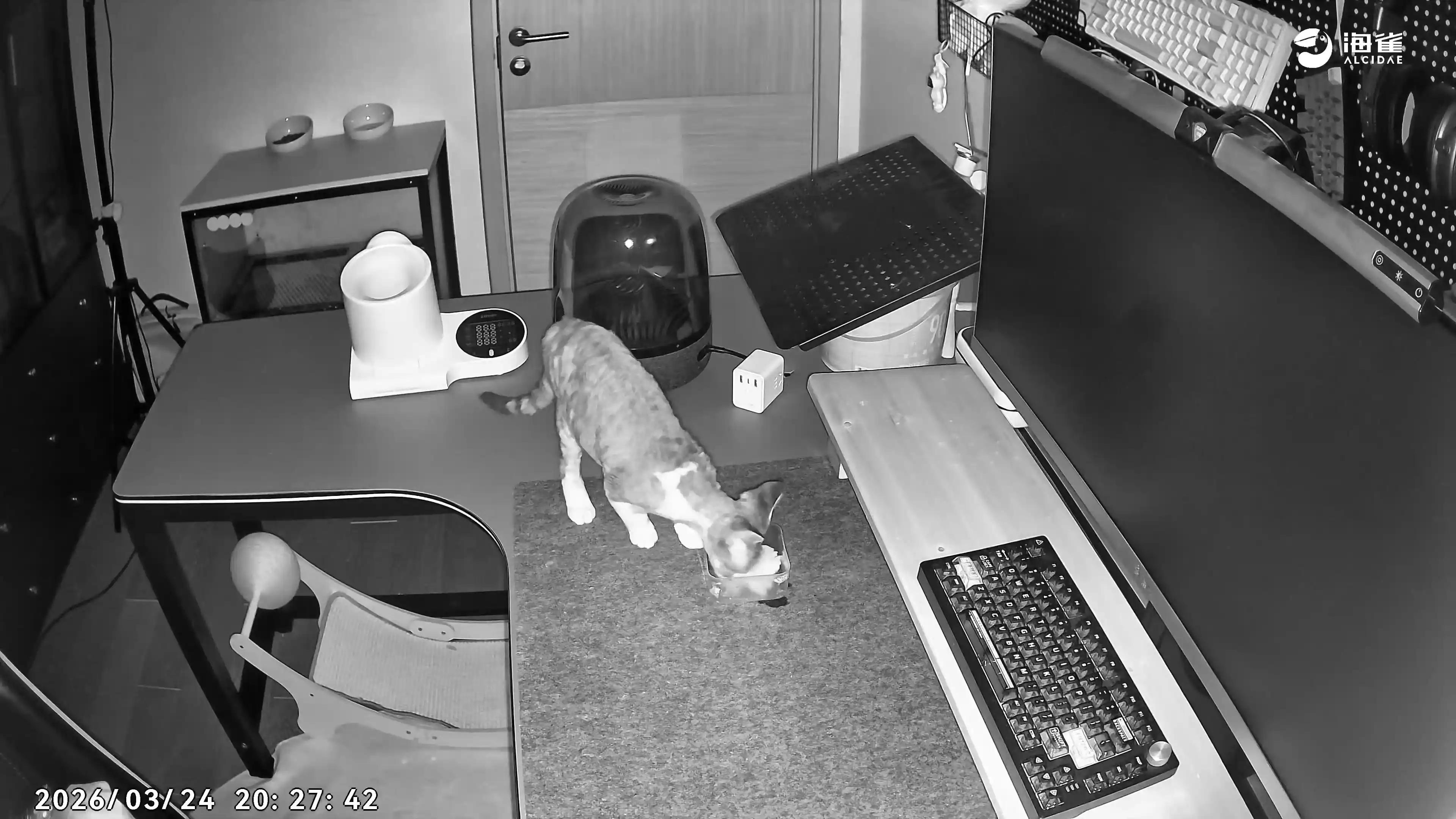 它的全景微光技术,哪怕是深夜走廊的微弱光线,也能还原出细腻的灰度画面,宠物跑过、家人起夜都能看得一清二楚。不管是晚上还是白天,开启摄像头打开语音功能,猫咪也能随叫随到了。