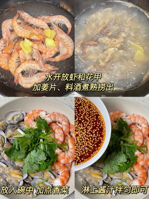 选材有讲究:花甲买回来先用淡盐水+几滴香油浸泡2小时以上(让其充分吐沙),中途换水2-3次;虾仁用鲜虾现剥或优质冷冻虾仁,解冻后去虾线;再备蒜末、小米辣圈、香菜段、姜片、柠檬半个,以及灵魂调料:生抽、香醋、蚝油、白糖、花椒油。