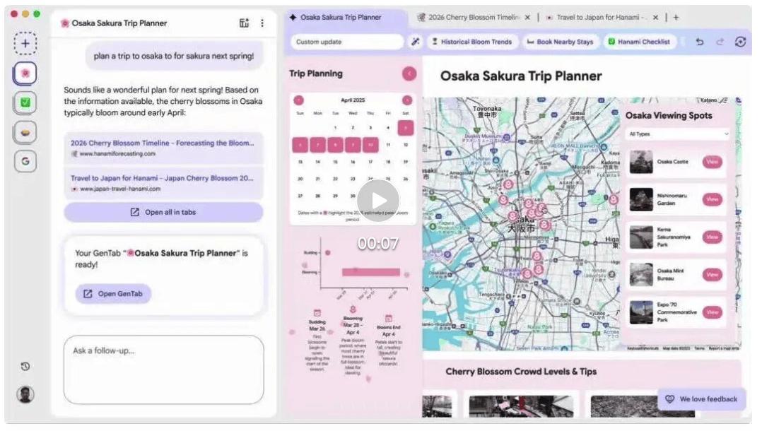 这是一个「浏览器中的浏览器」。GenTabs 是动态的,如果用户打开了新的相关网页,GenTabs 会自动抓取新信息并更新到交互界面中。