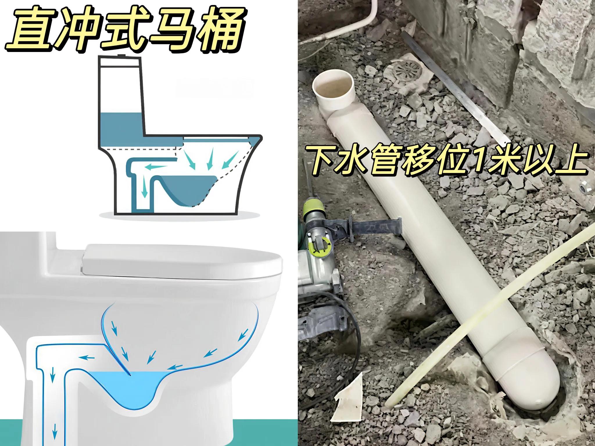 下水管道移位1米以上就选∶直冲式冲水,水路径直、管径粗,水流冲击力强,排污效率也很强,不容易堵塞;结构简单,维修成本低,但就是噪音有点大。