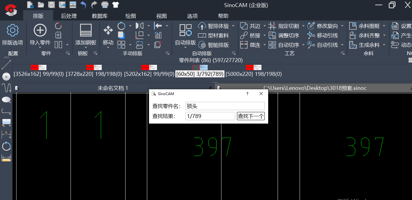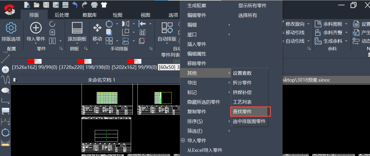套料排版中常常会出现这种情况,已完成的排版图中需要对于其中一种或几种零件进行批量编辑或者删除,而零件分布在多个排版图上,一个个查找的方式比较繁琐。