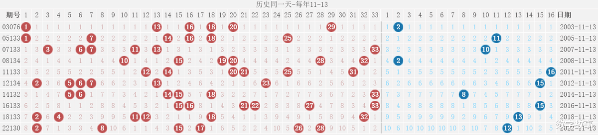 博弈心理,挑战概率: 看近期开奖号码,也可看历史数据统计!【双色球25131期多角度冷热号】双色球25131期四维走势图,红蓝号统计及冷热号1) 历史同一天: 11月13日 (共10期)