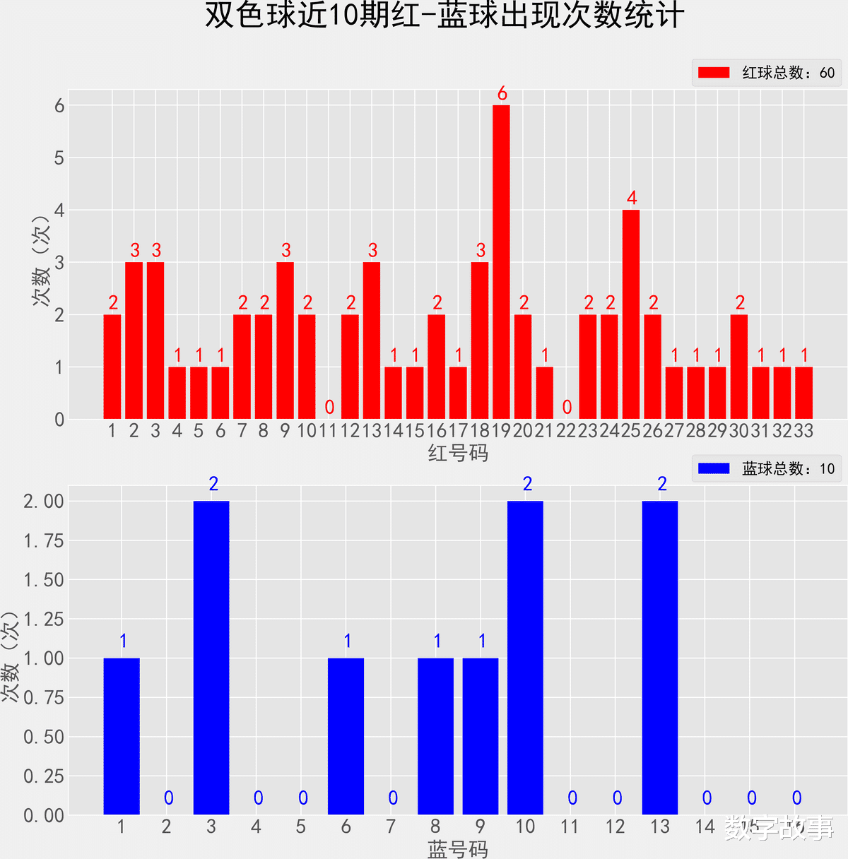双色球近10期红蓝号统计情况统计样本数据: 60个红球 10个蓝球