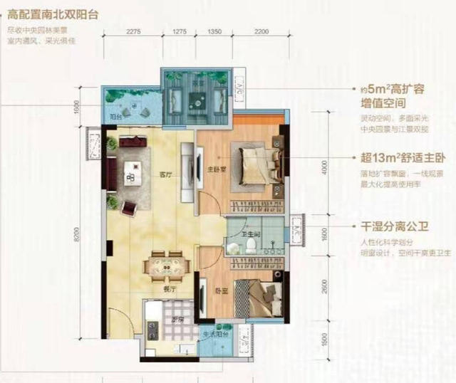 78㎡两房一厅一厨一卫: 该户型以紧凑实用的空间布局,巧妙地实现了两房的居住功能,在英德市场上具有较高的稀缺性,特别适合对居住空间有刚需、但又希望有一定的灵活性选择的人群。后期可根据家庭需求,灵活改造为书房或儿童房。此户型亮点包括:高配置南北双阳台,可享受客厅、卧室的阳光,通风透光,视野开阔;约5㎡的拓展空间,巧妙利用,增加了储物功能或打造个性化空间;超13㎡的舒适主卧,宽敞明亮,预留大面积飘窗,可作为休憩区;干湿分离公卫,遵循人性化科学动线,实现了干湿分离,方便日常生活。