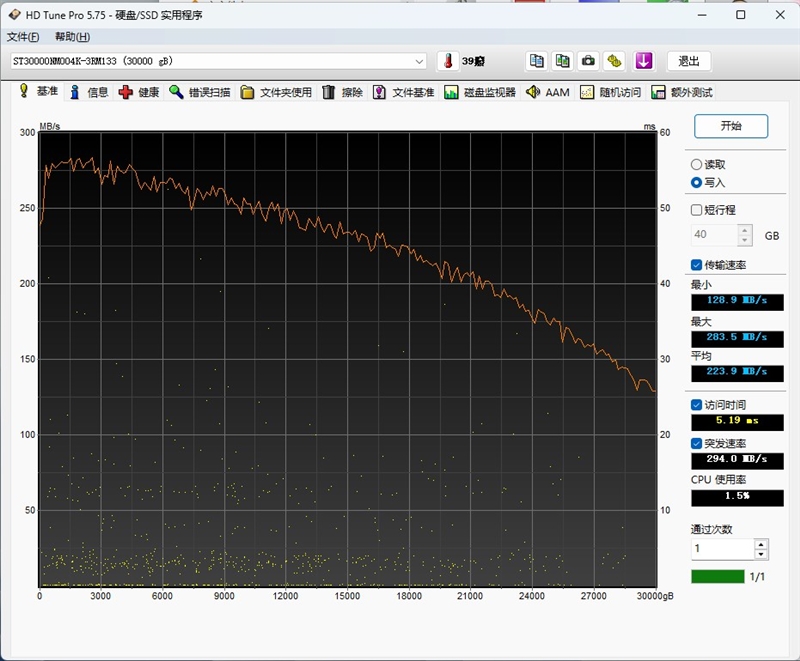 四、HD Tune测试:外圈写入280MB/s、内圈121MB/s