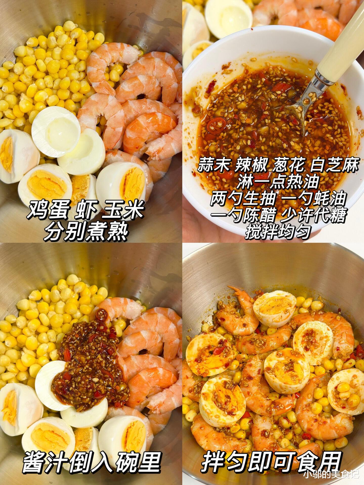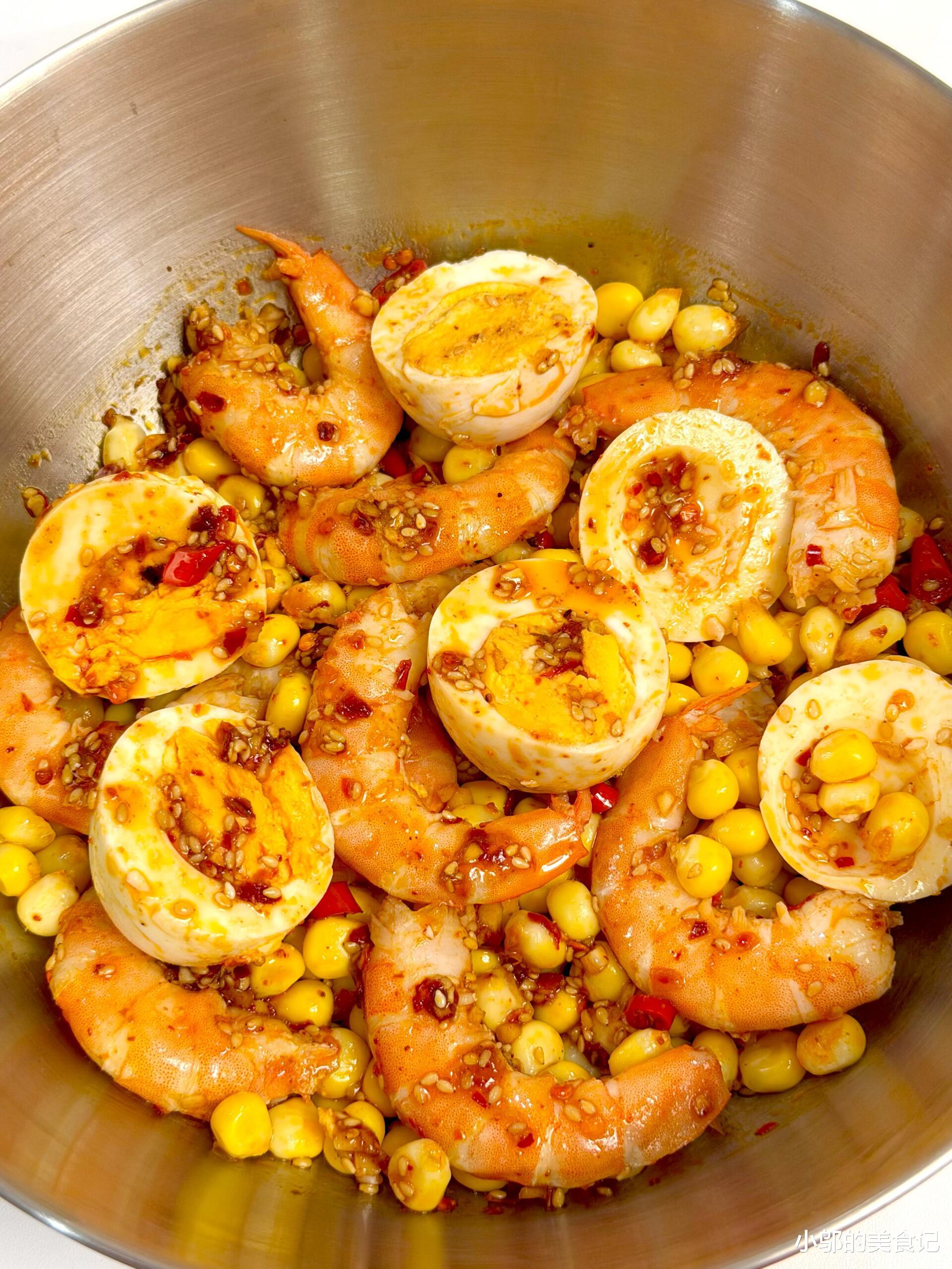 夹起一块裹满料汁的鸡蛋,软嫩的鸡蛋吸饱了鲜辣的料汁,咬下去的瞬间,料汁在嘴里散开,搭配上Q弹的虾仁,虾仁的鲜和鸡蛋的香完美融合,再咬上几颗清甜的玉米粒,解腻又爽口,三种食材的口感层次分明,每一口都充满了惊喜。这道菜不管是当正餐还是当凉菜都合适,家里来人的时候端上桌,总是被夸会做饭。