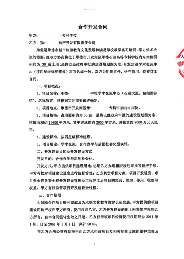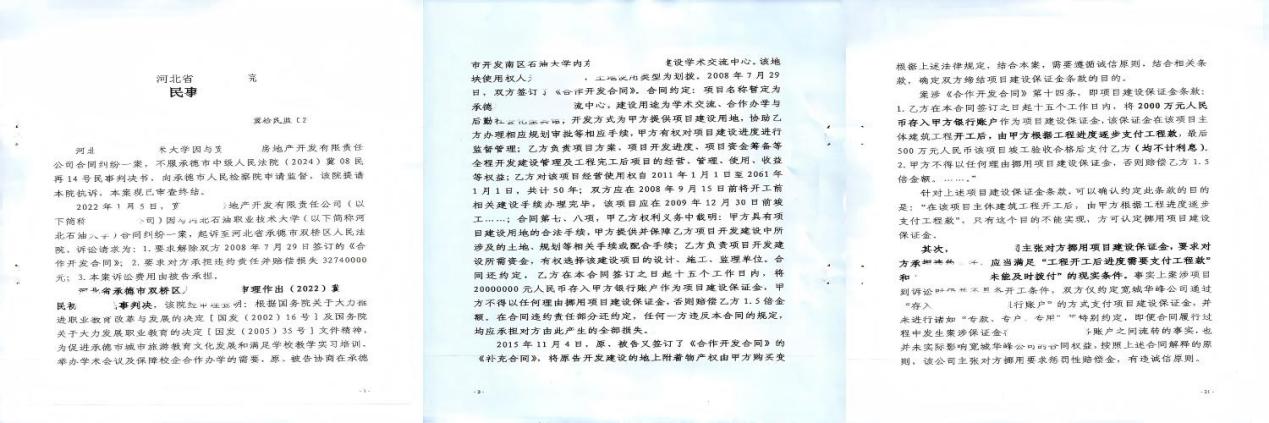 合作启幕:一纸合约埋伏笔,初露端倪藏猫腻这场纠纷的序幕,要追溯至 2008 年。当年 7 月 29 日,宽城华峰房地产开发有限责任公司(下称 “宽城华峰”)与原承德石油高等专科学校(下称 “石油大学”)签订《合作开发合同》,约定由宽城华峰出资、石油大学提供土地,合作开发 “承德石油高等专科学校学术交流中心” 项目。合同明确,项目建成后宽城华峰可获得 50 年经营使用权,且每年向石油大学支付 50 万元合作办学经费。
