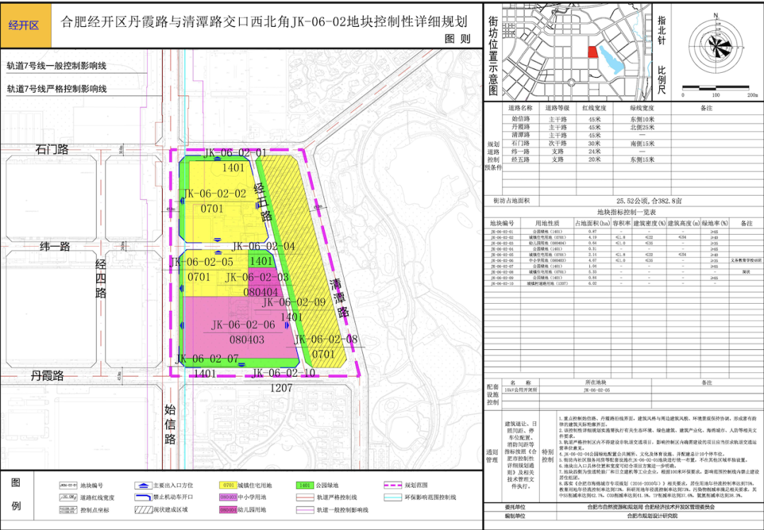 据合肥自然规划局公示,经开区JK-06-02地块控制性详细规划公示,地块位于经开区丹霞路与清潭路交口西北角,总占地面积约25.52公顷(约382.8亩),该地块控规属性为城镇住宅用地、幼儿园用地、中小学用地。