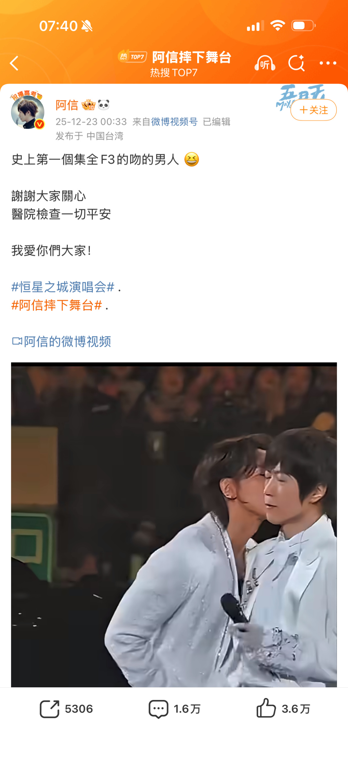 此前,在12月22日晚于上海举行的“F✦FOREVER 恒星之城巡回演唱会-上海站”演出中,阿信在表演时不慎摔下舞台,引发全场观众担忧。23日凌晨00时33分,阿信通过个人微博第一时间报平安,表示“医院检查一切平安”,并写道:“我爱你们大家!”相关话题“#阿信摔下舞台#”迅速登上热搜。