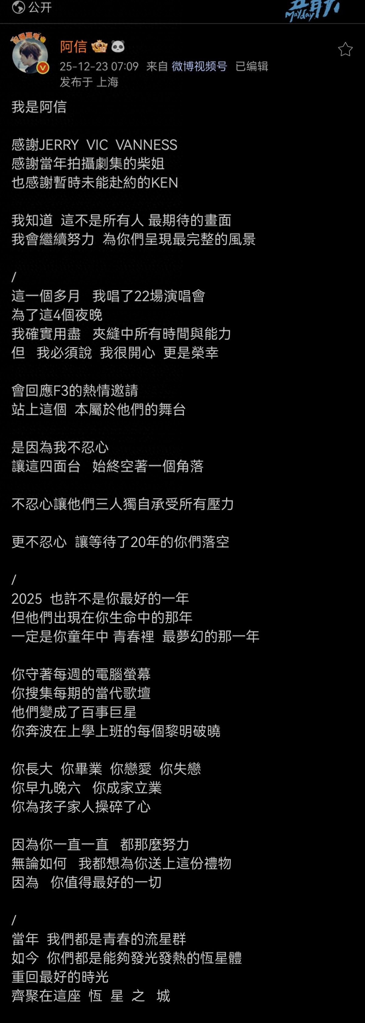 12月23日上午7时09分,五月天乐队主唱阿信通过社交媒体进一步说明参与本次“F✦FOREVER 恒星之城巡回演唱会”的初衷。他写道,站上舞台是因为“不忍心让舞台空着一角,也不忍心让等待了20年的观众落空”,并感谢所有关心他的观众与粉丝。
