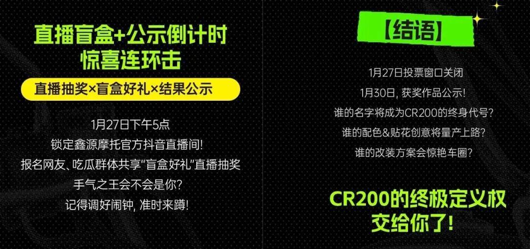 本次活动将于1月27日关闭投票窗口,参与投票与报名活动的车友们可以在1月27日下午5点的鑫源摩托官方抖音直播间进行“盲盒好礼”的抽奖。如果你一直都在关注这台车,不妨参与一下这次官方个性征集的活动,或许奖品就会落到你头上哦!