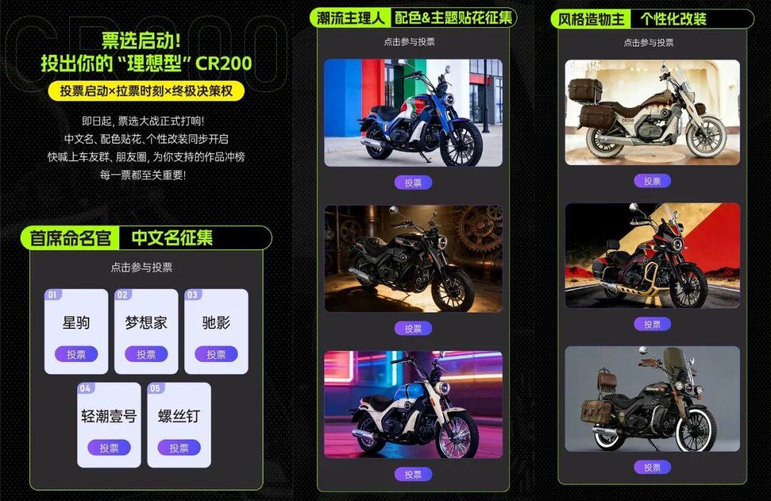 这次鑫源可谓是玩出了花,光配色的征集就多达 16 种,不论是运动元素、罗马印象、绘画艺术、甜蜜氛围、个性艺术、赛博朋克等等几乎满足所有不同“个性”需求的车友。除了配色的个性投票以外还带来了 5 种个性改装方案,包含日常实用、功能强化、做旧复古、视觉重构、摩旅属性等多方面的改装需求。