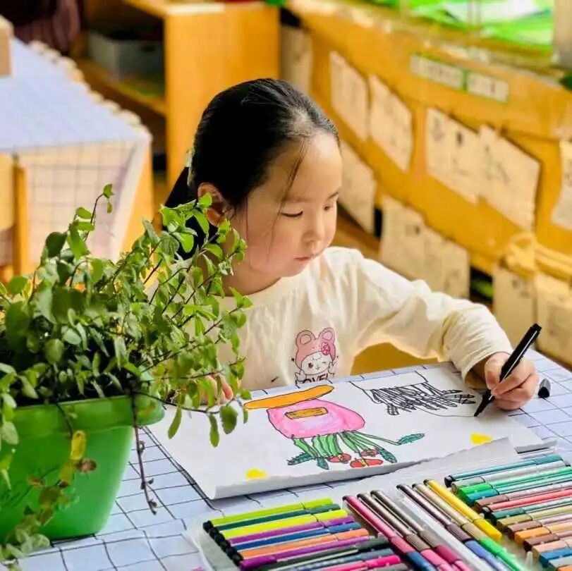 幼儿园的墙面、桌面、地面、树干......都成为孩子的创作画布,无论是小组活动后的灵感迸发,还是自由游戏时的即兴创作,孩子们都能随时拿起工具,记录下自己的想法。这种开放、多元的环境,为孩子的自主创作提供了充足的土壤,让他们在潜移默化中感受艺术与生活的紧密联系。