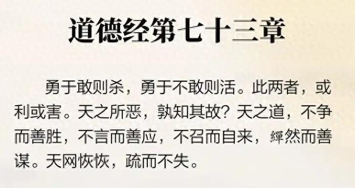 勇于敢则杀,勇于不敢则活。此两者,或利或害。天之所恶,孰知其故?是以圣人犹难之。天之道,不争而善胜,不言而善应,不召而自来,繟然而善谋。天网恢恢,疏而不失 。