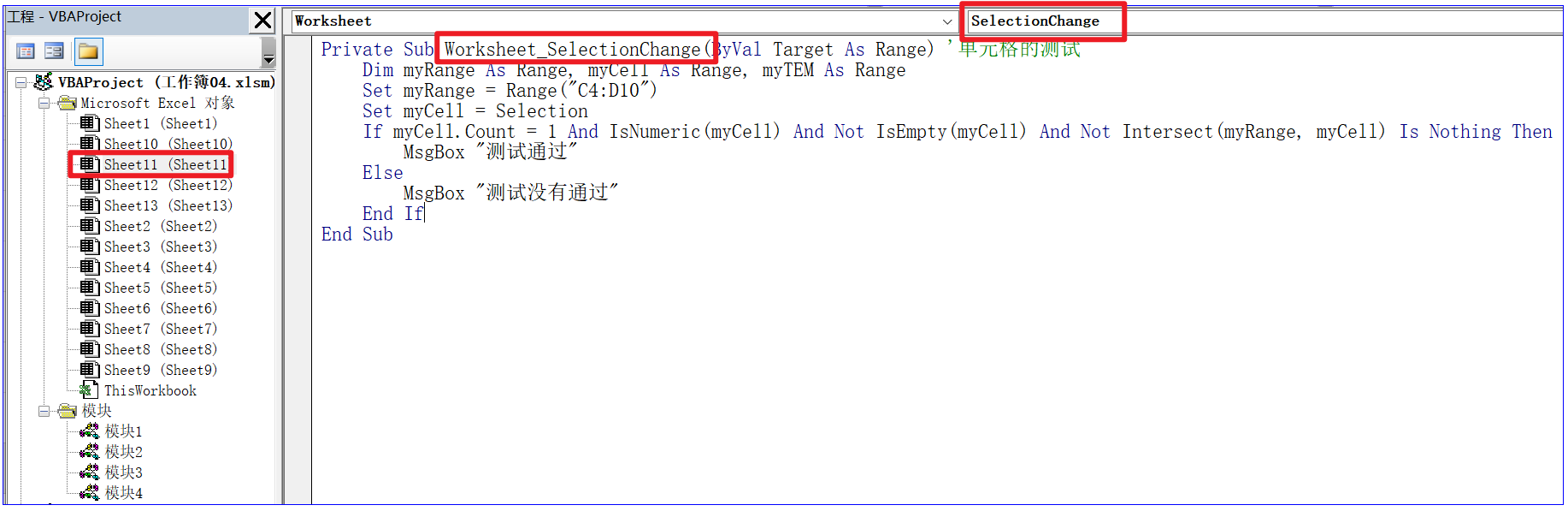 3 单元格测试的应用实例下面我们将利用一个实例代码对单元格进行一些测试判断,测试的内容有:单元格区域的数量是否为一个;是否为数值;以及是否为与单元格区域C4:D10的交集。