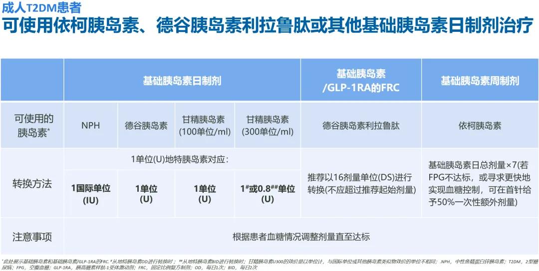 转换为中性鱼精蛋白锌胰岛素(NPH)、德谷胰岛素或甘精胰岛素U100治疗时,剂量换算均为1单位地特胰岛素对应1单位目标胰岛素[1-3];