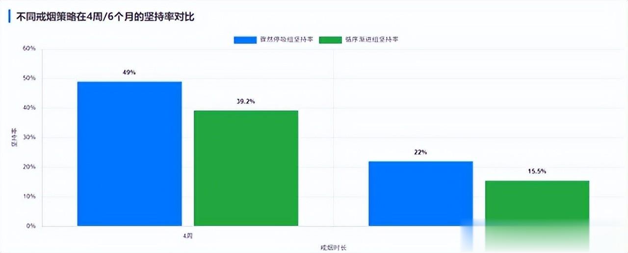结果显示:在戒烟4周后,骤然停吸组的坚持率为49.0%,而循序渐进组为39.2%;到了6个月,这一差距仍然存在(骤然停吸22.0% vs. 循序渐进15.5%),数据显示,骤然停吸比循序渐进更容易成功戒烟。