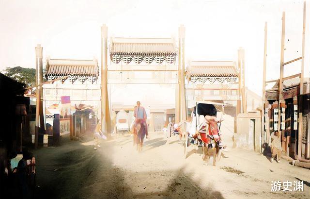 紫禁城边上有一座四根柱子、三间宽的过街牌坊,前后还加了斜撑柱子。牌坊底下,驴车悠悠地过,骑马的大汉嗖嗖地跑。旁边,一个拉洋车的师傅蹲路边的小坑里,等着拉活儿。要说清末时候的北京城里,到底立了多少座这样的牌坊,怕是没人能数得过来了。