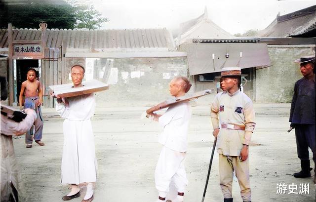 有几个犯人脖子上套着木架子,在街上给人看,旁边站着一个戴着圆斗笠、拿着警棍的警察。把犯人拉到大街上让大家瞧,这法子以前觉得挺能教育老百姓的,所以用了好多年。一直到了九十年代,这种做法才没了。