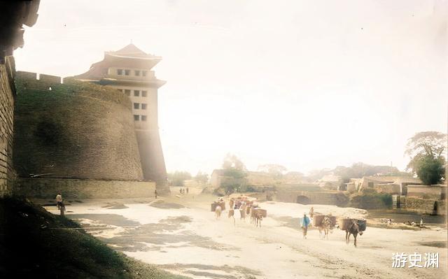安定门箭楼旁边,一队驮着货物的驴子正慢悠悠地走在城外的大路上。那高大的城墙弯成弧形,站在城墙下面的路人看起来特别小。