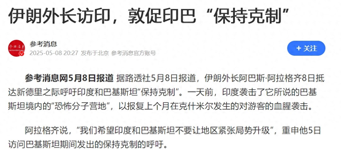 据《参考消息》报道,伊朗外长8日抵达新德里之际呼吁印度和巴基斯坦“保持克制”。