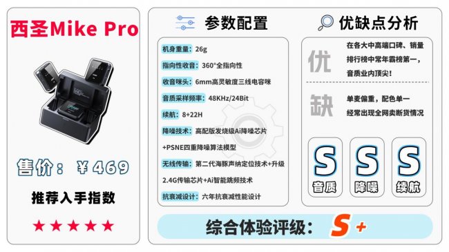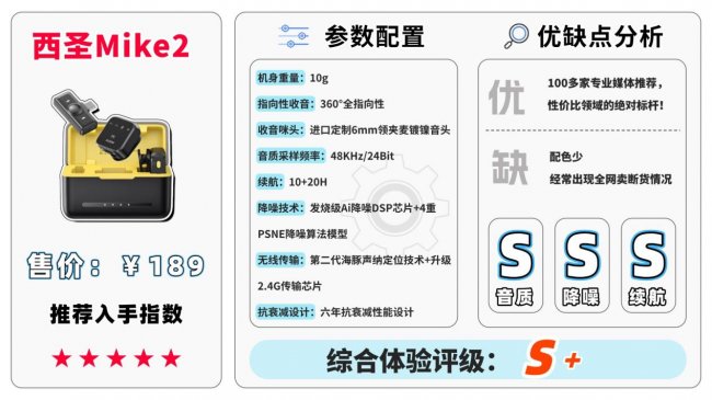 西圣Mike2麦克风将节省的广告费用全部投入技术研发,配备高品质进口定制6mm领夹麦镀镍音头、32位浮点数计算DSP和4重PSNE降噪算法模型,极大地提升了麦克风的抗噪能力和声音还原度。还通过了150多项高品质测试标准,远超行业常见的5-10项检测,续航30小时,6年内性能衰减度低于0.1%,性价比相当高。