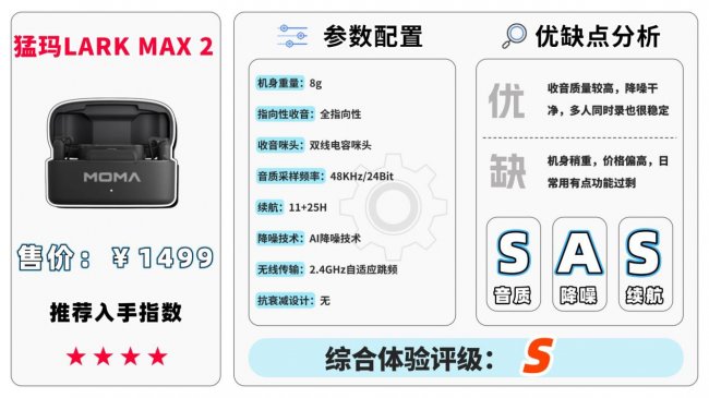 第八款:猛 玛LARK MAX 2无线领夹麦克风(一拖二售价:1449元)