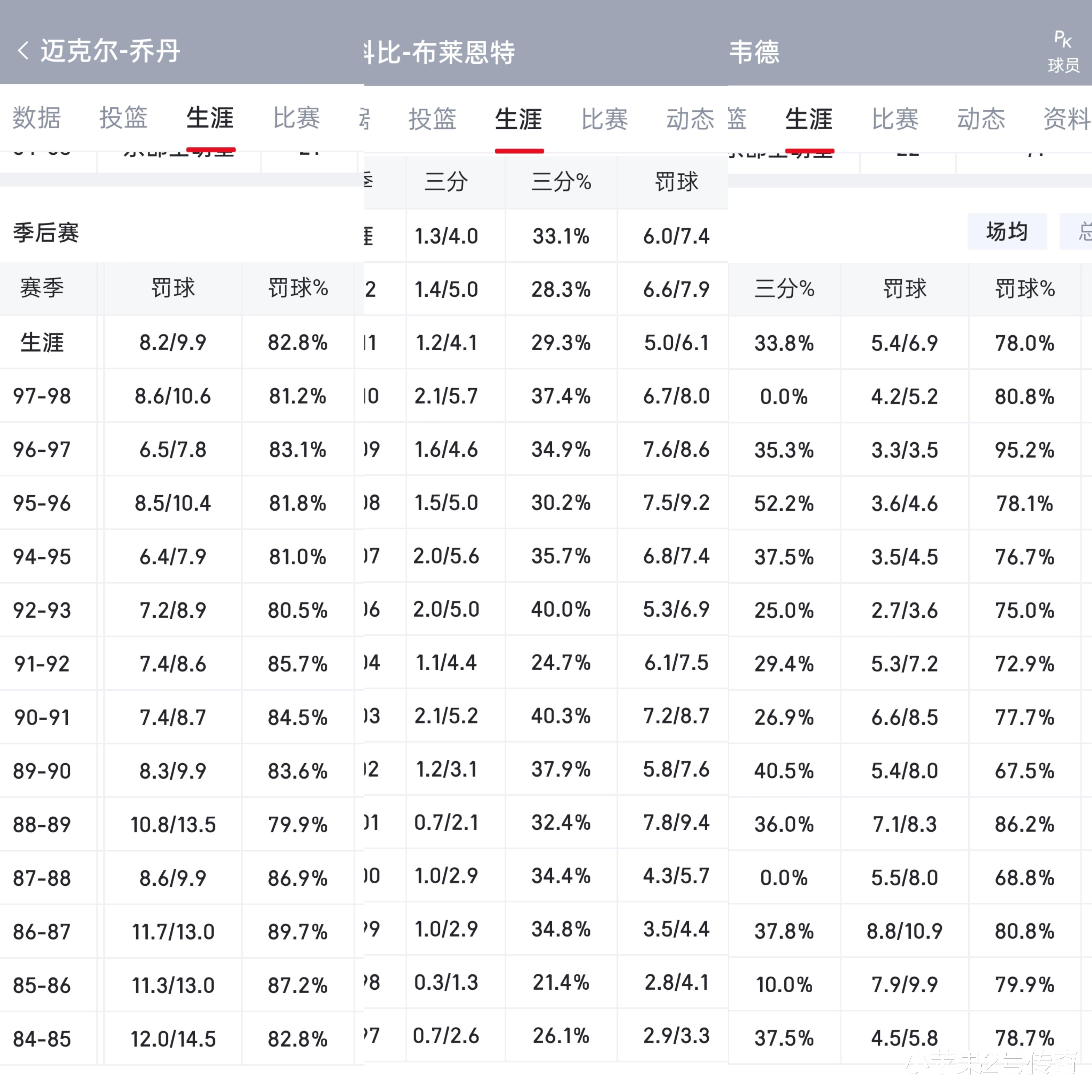 我们还是先来看看历史前三位分卫季后赛罚球上双的情况吧,乔丹罚球上双是6次,韦德是一次,科比是一次都没有。