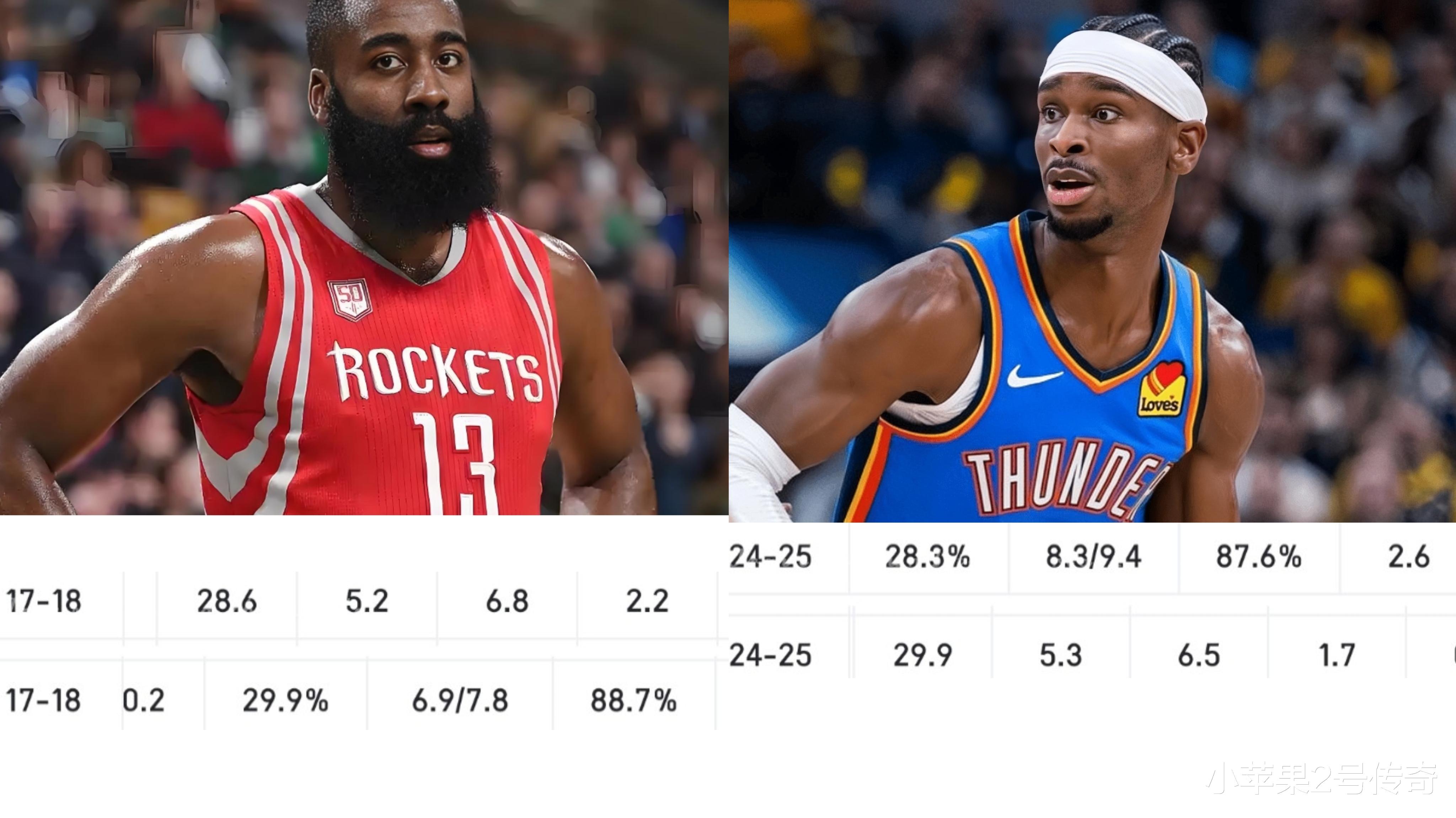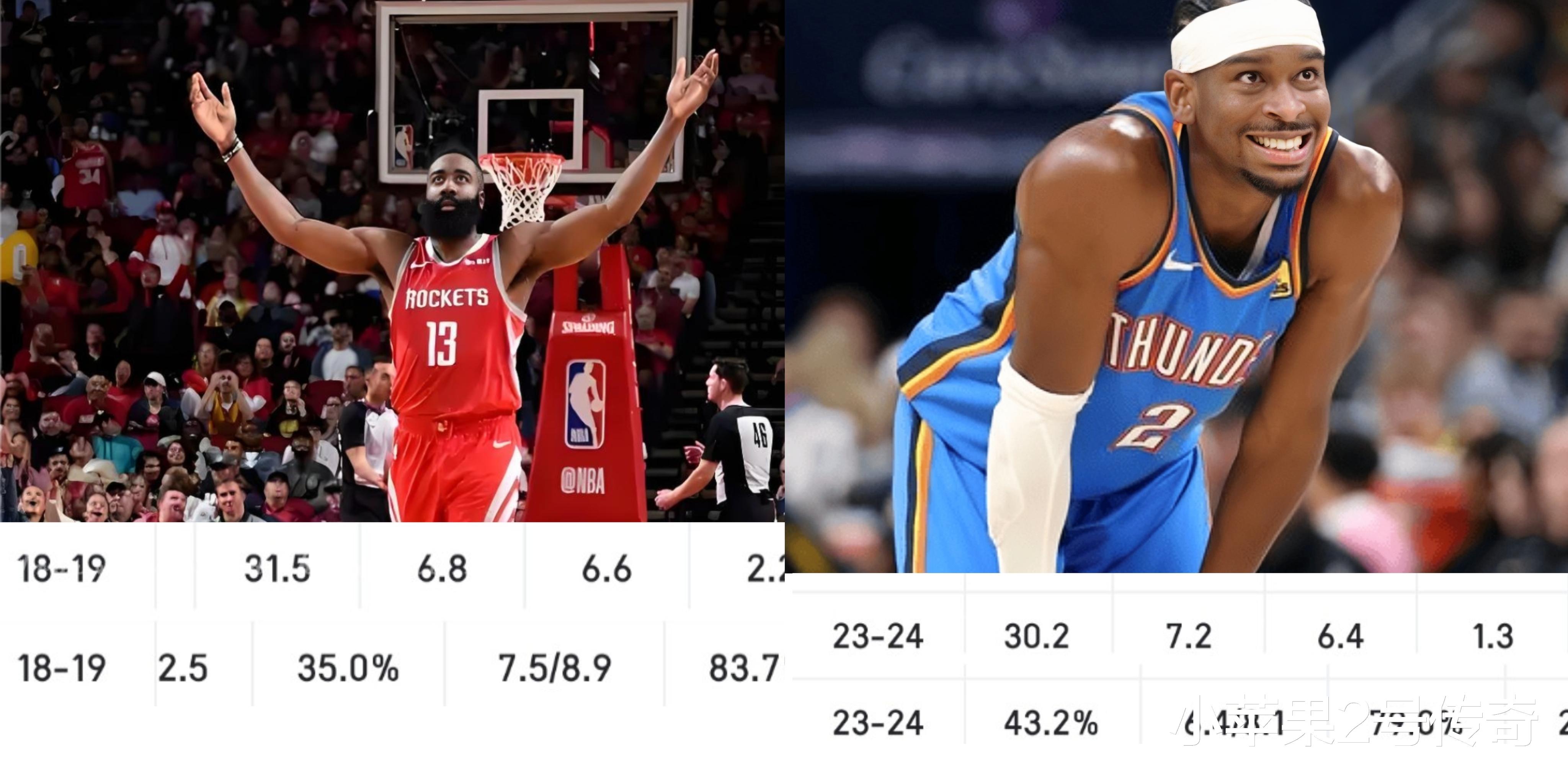 在对比一下俩人截止目前为止,单赛季季后赛场均得分最高的一个赛季,哈登是18-19赛季季后赛场均得分最高,场均31.5分,8.9次罚球。亚历山大是23-24赛季,场均30.2分8.1次罚球,俩人都减去罚球的情况下,哈登是22.6分,亚历山大是22.1分。