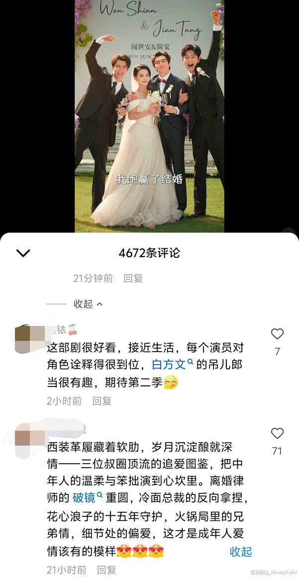 尽管这部短剧的切入点是中年男性视角,但是,里面涉及到不少独立女性的价值观,并引发了广大女性观众的共鸣。