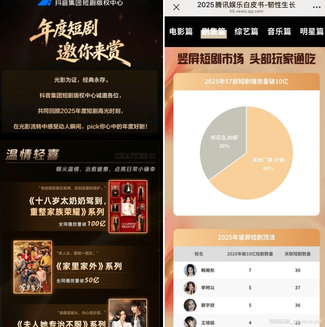 正是有这样的态度,听花岛才成为国内头部短剧厂牌。不管是爆款短剧数量,还是头部短剧演员,可以说占到短剧行业半壁江山。这从2025年全年的短剧数据中就能看出来。